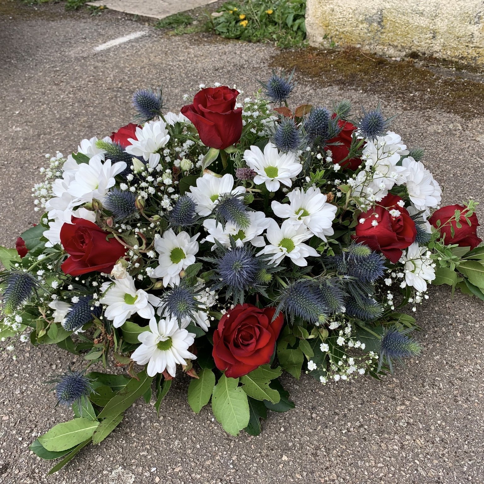 Composition : Rose, chrysanthème, chardons, gypsophile, laurier.