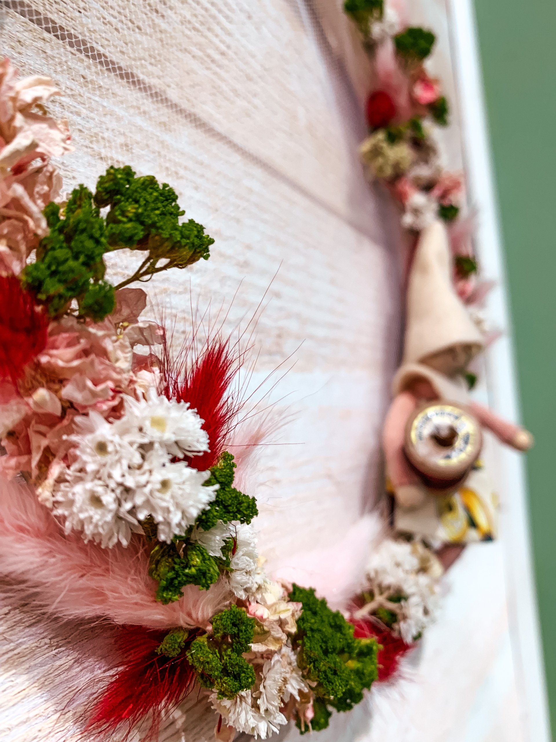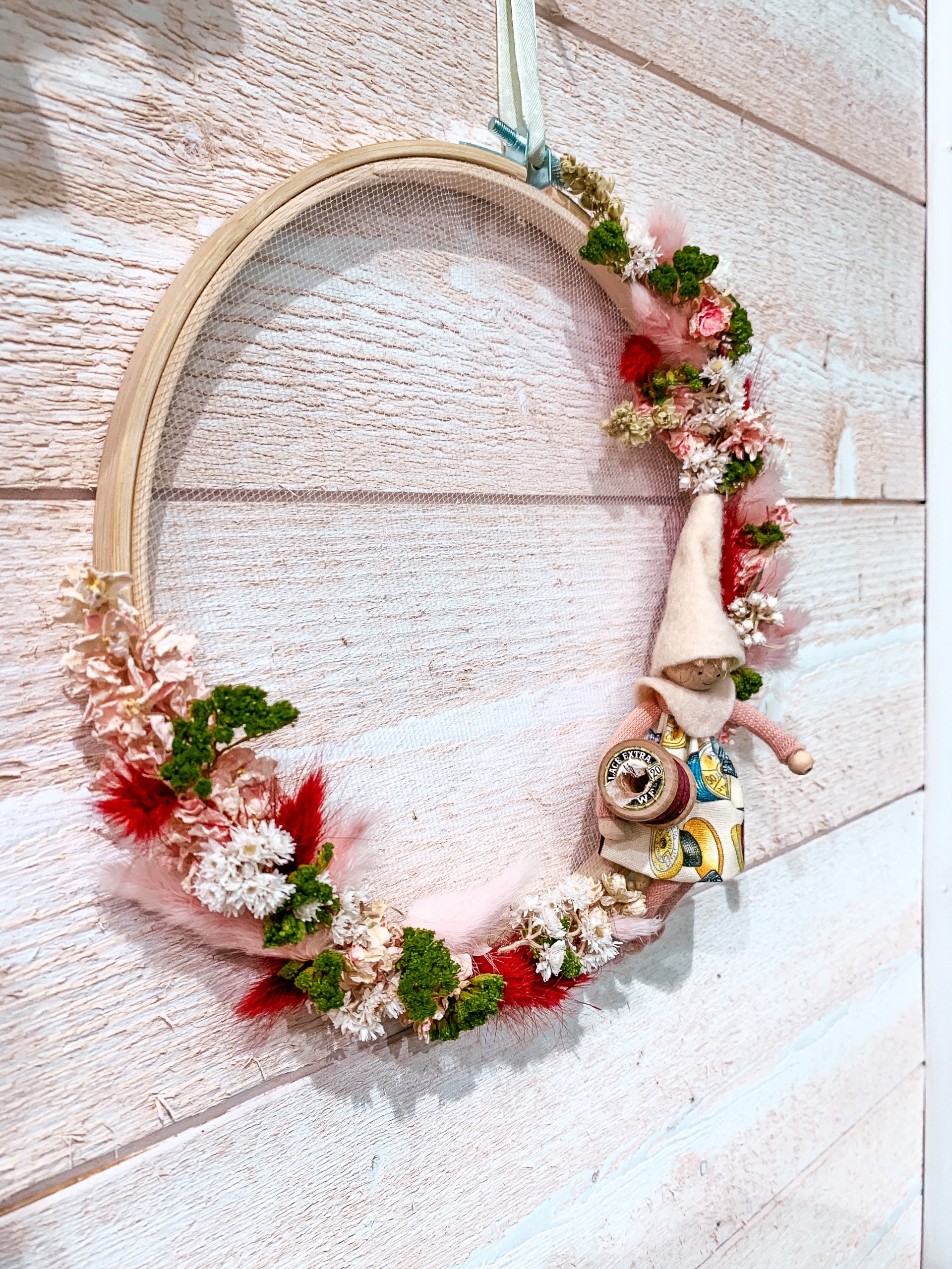 Ce cercle de broderie est 100% sur mesure. Une compositon en fleurs séchées, dans les tons rappelant ceux de la petite poupée.
