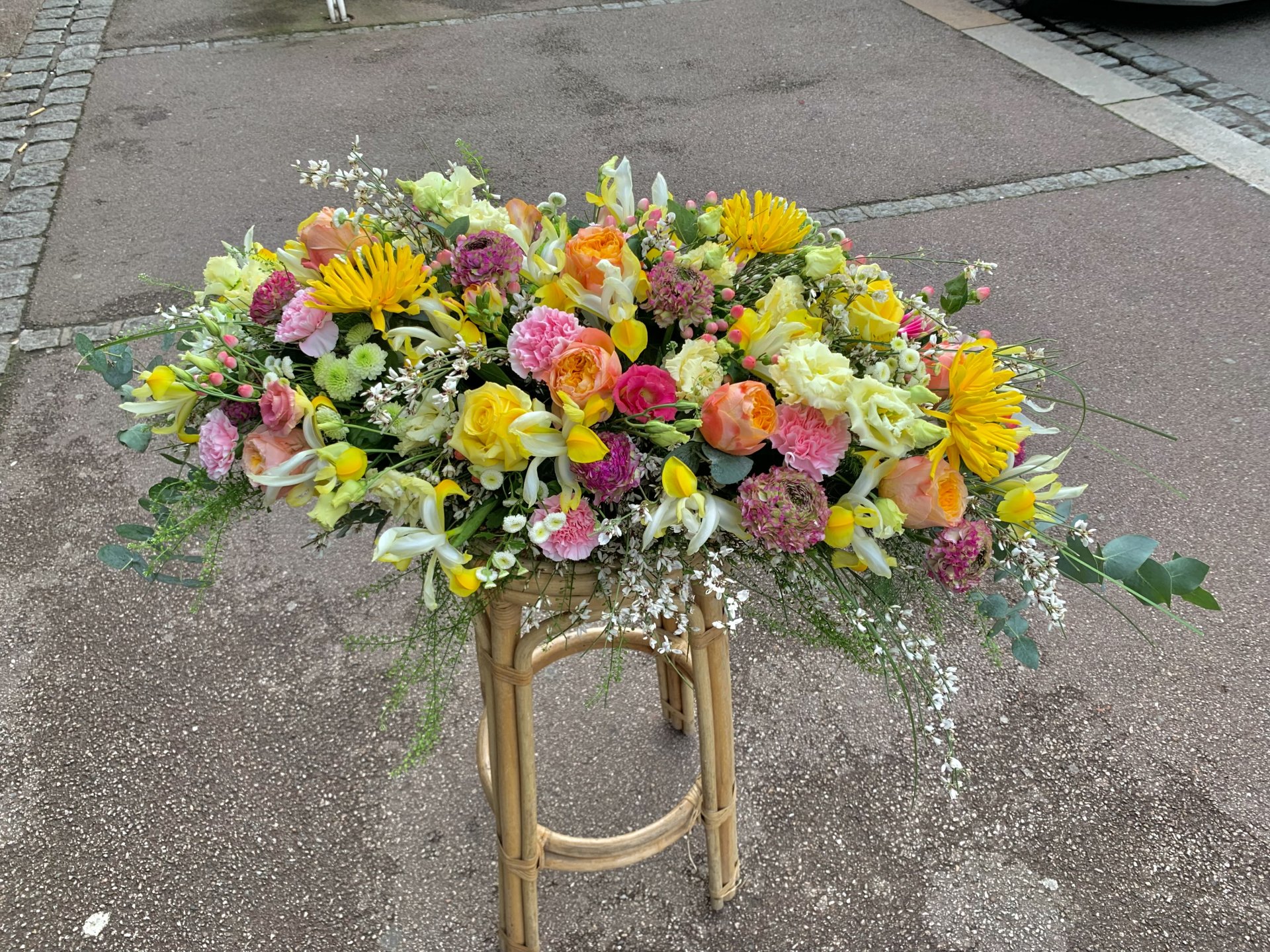 Composition : gerbera, rose, chrysanthème, genêts, oeillet, hypéricum, iris, eucalyptus, lisianthus.
