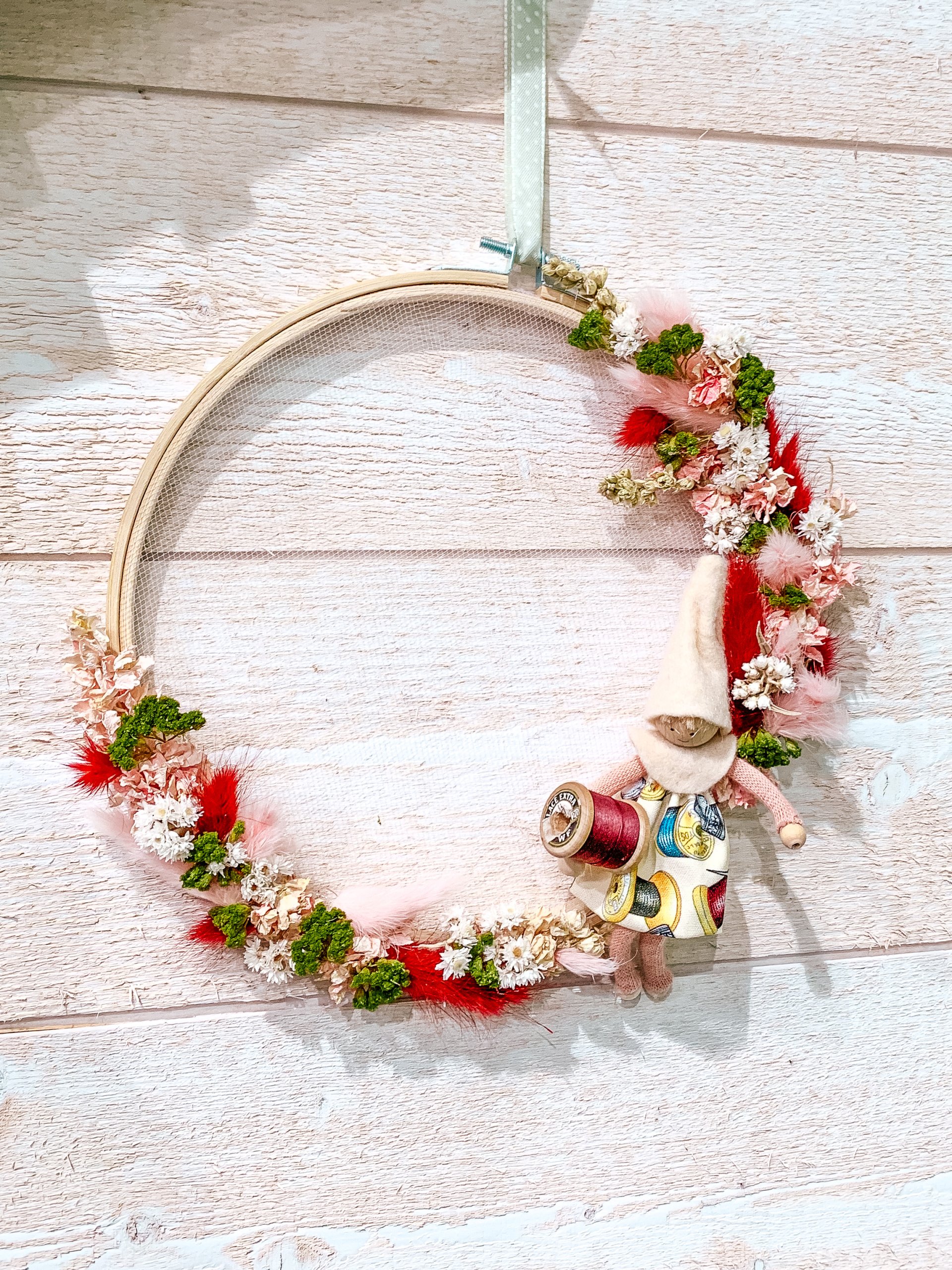Ce cercle de broderie est 100% sur mesure. Une compositon en fleurs séchées, dans les tons rappelant ceux de la petite poupée.