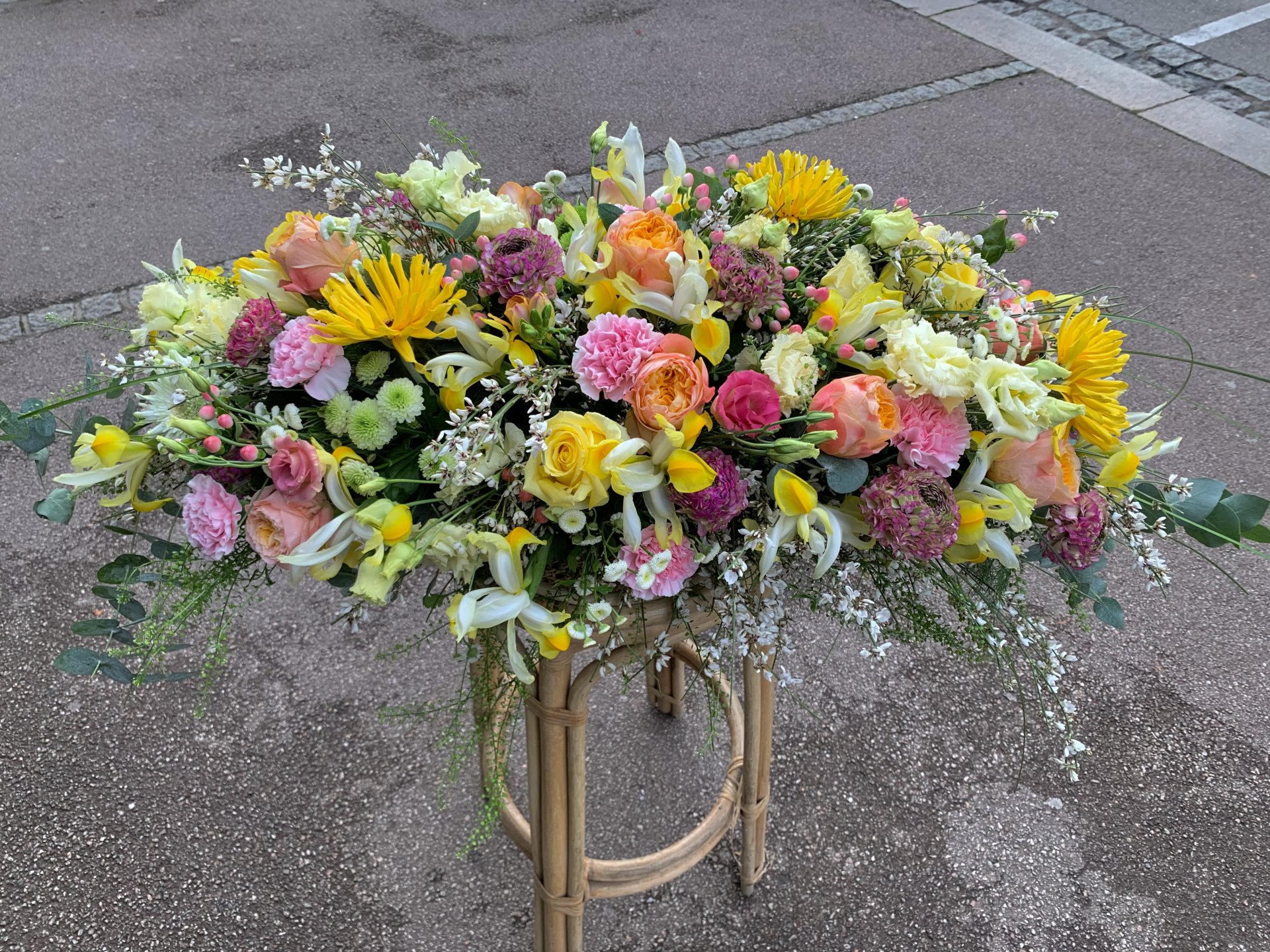 Gerbe allongée de fleurs coupées pour un décès.
