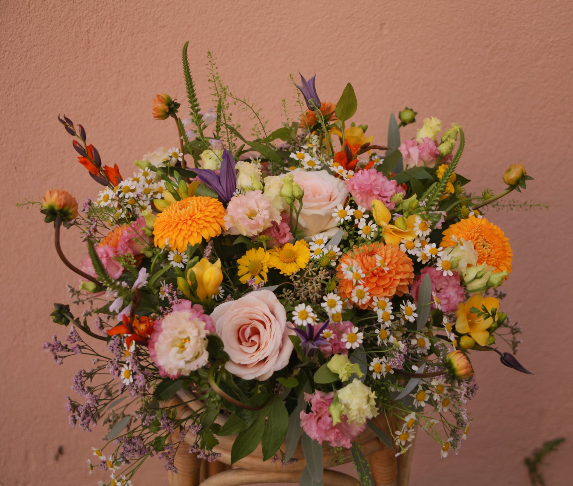 Composition : lisianthus, rose, limonium, freesia, camomille, dahlia, crocosmia, clematite, lysimachia, eucalyptus.