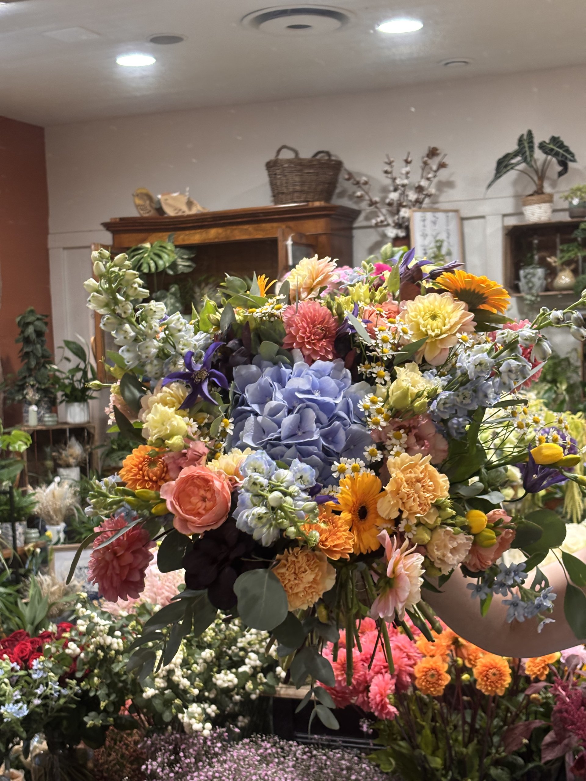 Composition : rose, hortensia, gerbera, oeillet, dahlia, clématite, delphinium, camomille, freesia, lisianthus, oxypetalum, cotinus, eucalyptus.