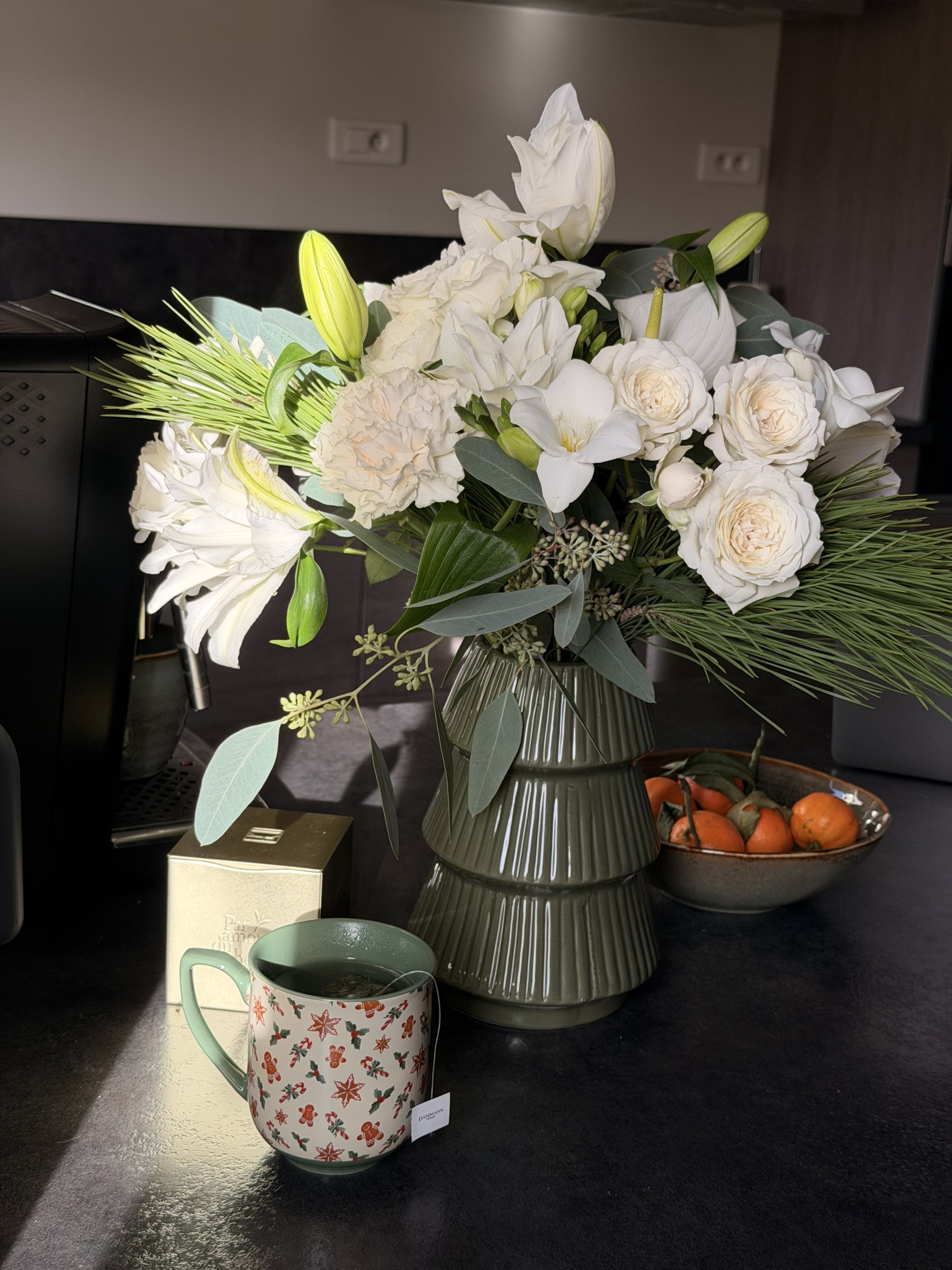 Composition : rose branchue, lys double, anthurium, oeillet, freesia, pin, eucalyptus.