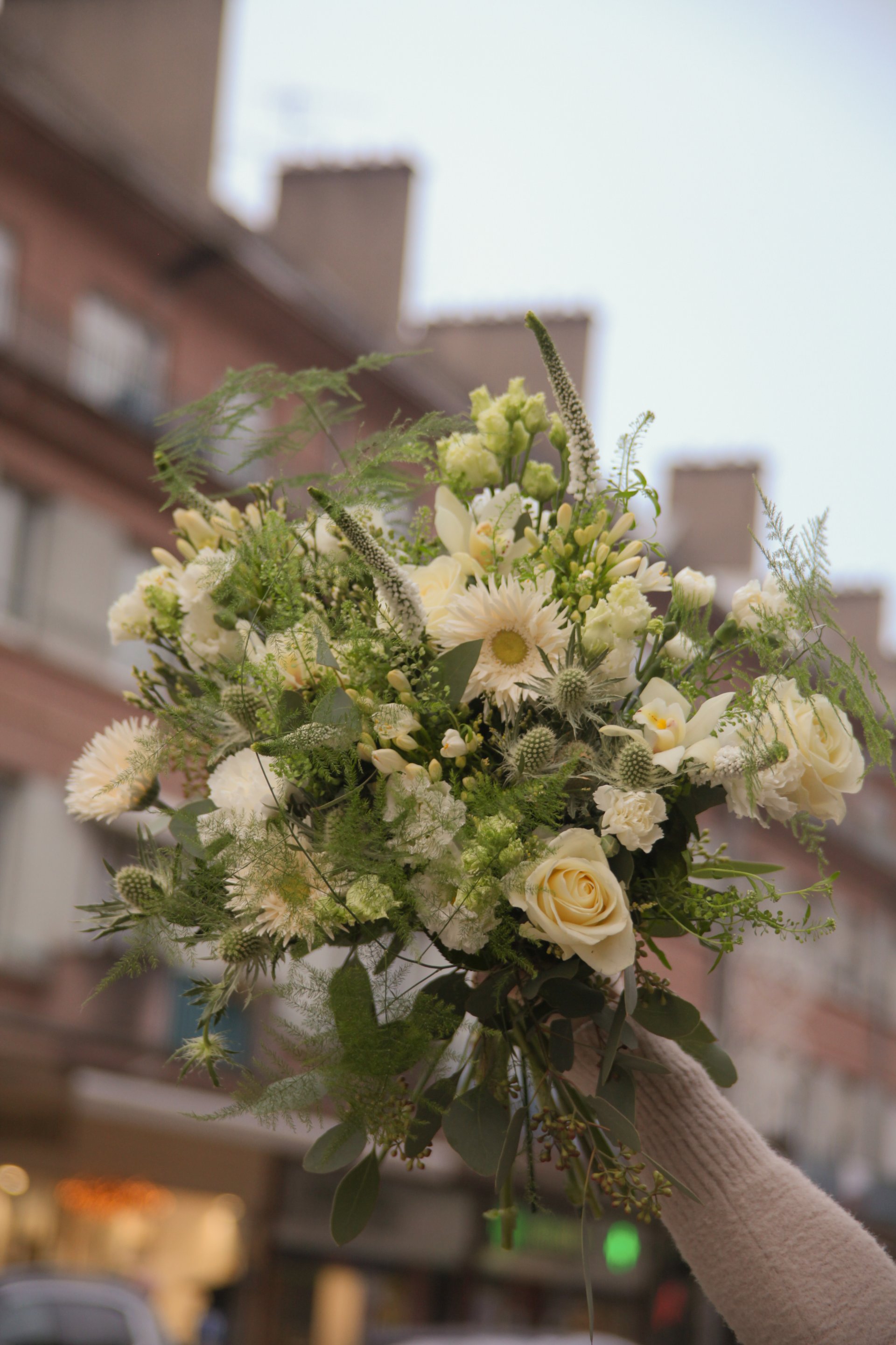 Composition : rose, gerbera, cymbidium, chardon, véronique, agaçante, mini oeillet, lisianthus, thlaspis, asparagus, eucalyptus.