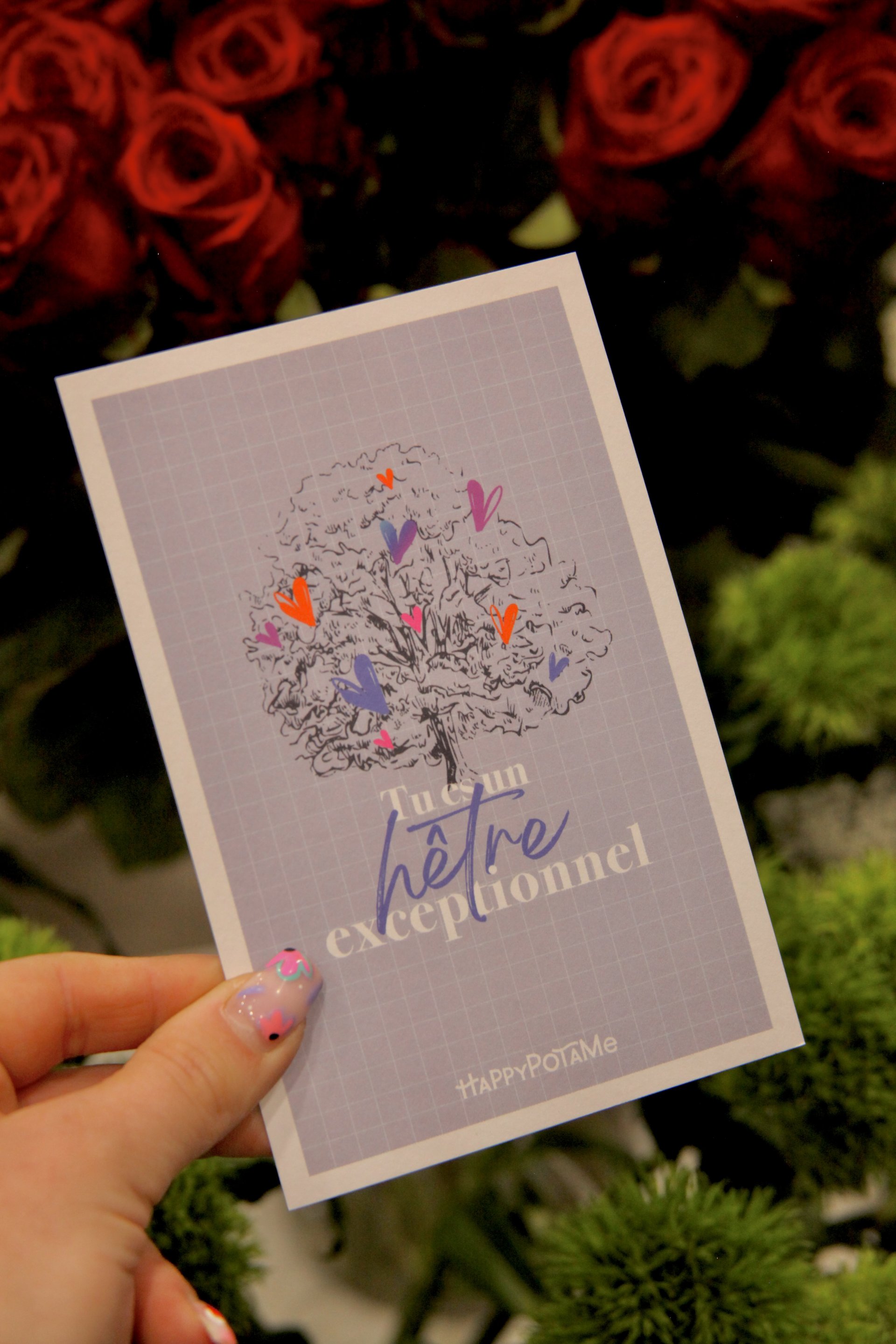Happypotame : elle propose de jolies cartes colorées, accompagnées de jeux de mots mignons, rigolos, et parfois même osés ! De belles illustrations mettent en scène des animaux et des fleurs.