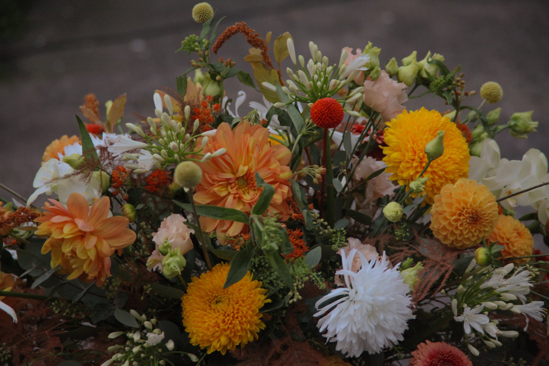 Cette composition délicate et lumineuse, réalisée avec des dahlias, chrysanthèmes, roses et feuillage naturel, exprime toute notre tendresse en ces moments difficiles.